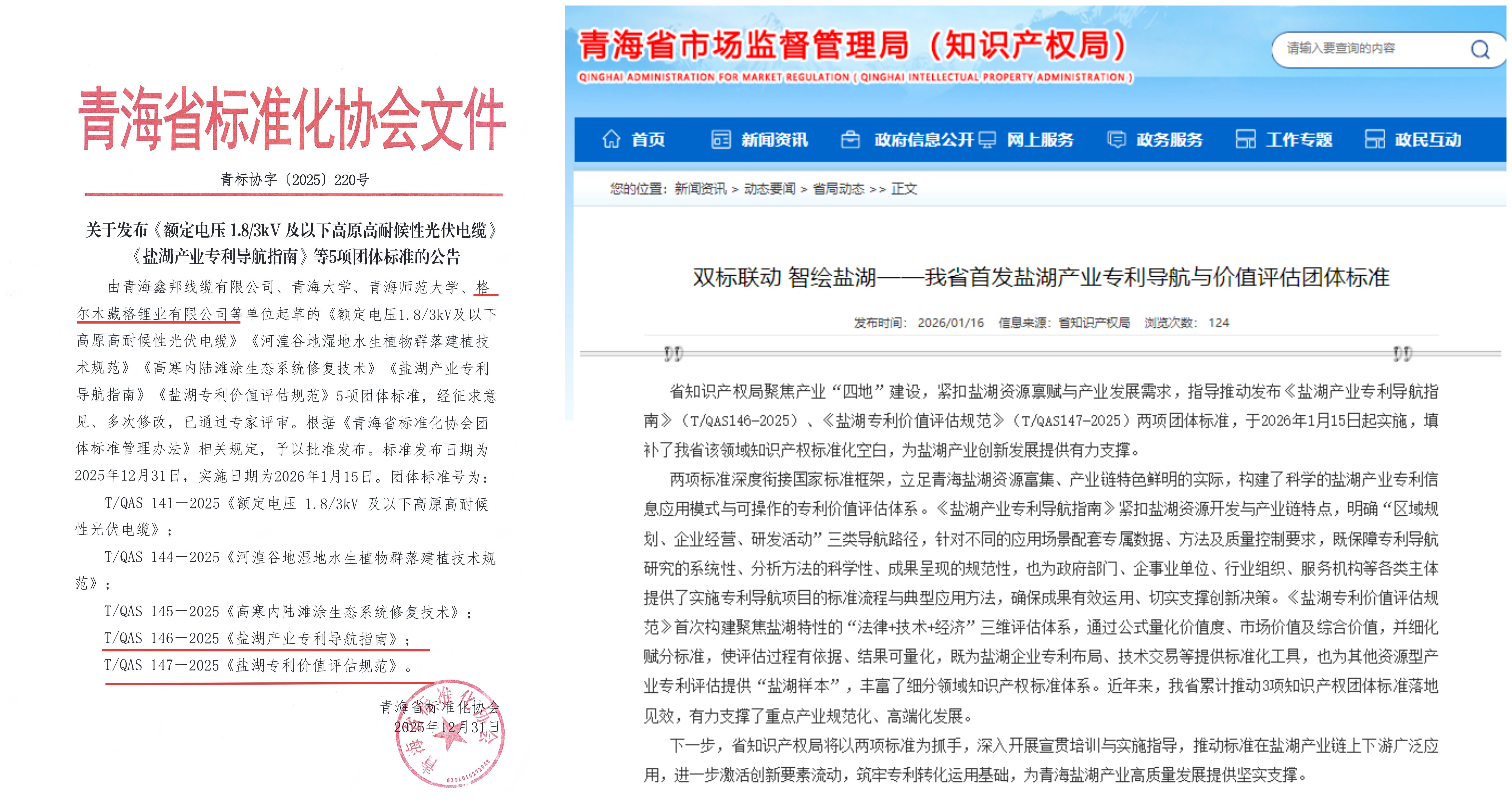 近日,由格尔木藏格锂业有限公司主导起草的《盐湖产业专利导航指南》(T/QAS146-2025)与《盐湖专利价值评估规范》(T/QAS147-2025)两项团体标准正式发布实施,填补了该领域长期以来的行业空白。这一成果不仅得到青海省知识产权局的高度认可与专题报道,更为盐湖产业创新发展注入强劲动力。